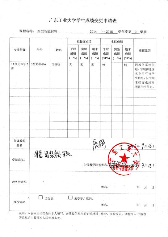 各位老师: 根据《广东工业大学理论课程考核管理办法》(广工大教字【2007】15号)文件之相关规定,现就bw必威西汉姆联官方网站开设的《新型智能材料》(2014-2015-2学期)学生成绩变更事项予以公示。 公示时间:2015年9月16日至2015年9月23日 如有异议,请署名书面反映到学院教务办公室,不接受匿名投诉。 电话:39322571