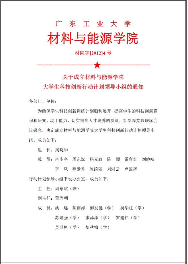 院字12年4号(关于成立材料与能源学院大学生科技创新行动计划领导小组的通知)