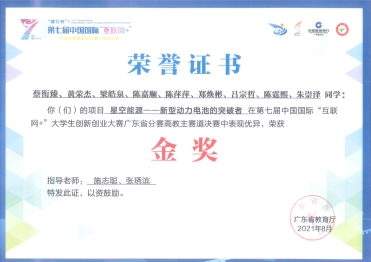 陈霆熙(18级新能源材料与器件专业):本科成绩名列前茅,获得国家奖学金、互联网+大学生创新创业竞赛广东省金奖、“挑战杯”广东省大学生课外学术科技作品竞赛二等奖,毕业后保研成都电子科技大学。