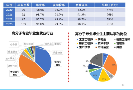 高分子材料与工程专业依托材料科学与工程一级学科,坚持“与广东崛起共成长、为广东发展做贡献”的理念,服务于大湾区战略性新兴产业集群,着力培养创新型工程技术人才。经过四年制本科学习,学生能够掌握高分子材料与工程专业知识,掌握独立分析问题、解决实践问题以及持续发展的能力,具有创新精神,具备较高的综合素质,能在高分子材料的制备、改性、加工成型、模具设计与制造等领域从事科学研究、技术开发、工艺设计、生产制造、分析检测及经营管理等工作。现每年招生约100人,众多毕业生已成为广东,尤其是大湾区,经济社会建设的中坚力量。