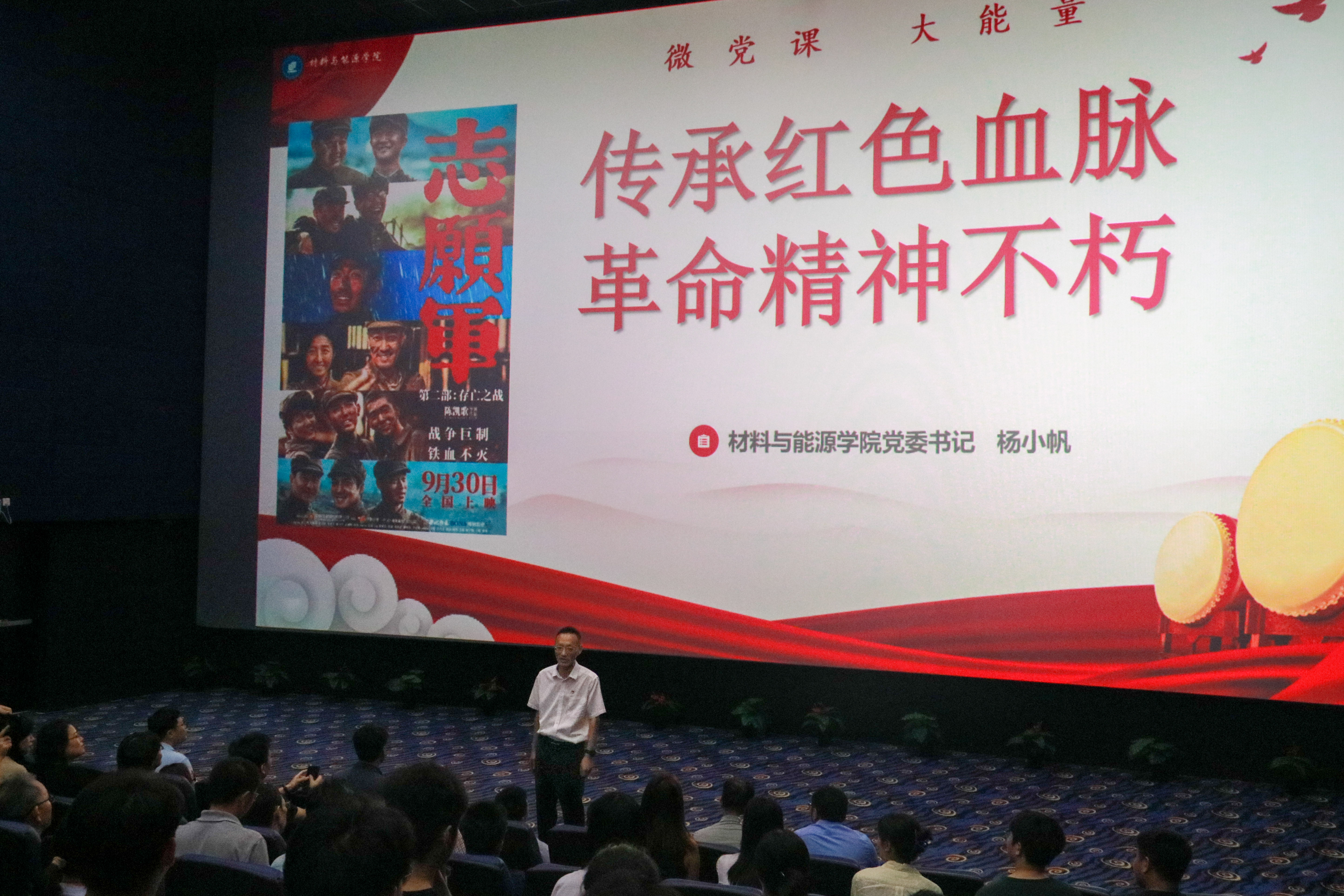 为庆祝中华人民共和国成立75周年,弘扬爱国主义精神,增强党员师生的历史使命感和责任感,10月15日下午,材料与能源学院组织100余名师生党员,前往番禺区金逸珠江国际影城(大学城店)观看影片《志愿军:存亡之战》。学院党委书记杨小帆结合弘扬伟大抗美援朝精神,为师生党员上了一堂微党课。