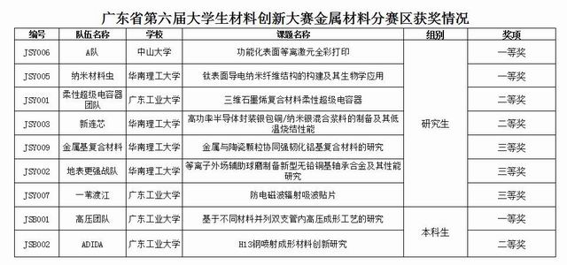 为培养材料类大学生的创新思维和科研能力,激发学生科研兴趣,鼓励学生成长为具有科研创新意识和善于挖掘科研价值的创新型人才,由广东省材料研究学会主办,广东省科学技术协会指导,bw必威西汉姆联官方网站承办的广东省第六届大学生材料创新大赛金属材料赛区决赛于11月20日上午在教学四号楼301拉开序幕。华南理工大学刘江文教授、暨南大学张治国教授、中山大学任山副教授、广东工业大学李风教授担任此次大赛评委。bw必威西汉姆联官方网站团委副书记张琇滨老师以及晋级分赛区决赛的队伍参加出席本次大赛。 本次金属分赛区决赛共有来自华工、中大、广工等多所高校的共9支队伍进入决赛,大赛评审规则介绍完毕后,各支参赛队伍按抽签顺序依次上台对自己的材料创新科研成果进行PPT演示与答辩。各参赛队伍由所研究领域背景及现实工艺中所存在的不足引出他们的创新点以及思路进程,通过对实验数据进行缜密分析与总结,阐明他们的创新点所能带来的社会应用价值。PPT演示环节,展现出各参赛队伍的创新思维与科研能力;答辩环节则充分体现了各队伍的科研热情与科创精神。团队精彩的展示,答辩严密的思维,作品大胆的创新,充分体现出当代大学生敢于开拓进取、勇于攀顶高峰的创新精神。 现场评委针对作品给予各参赛队伍中肯点评,悉心指出待改进之处,并对创新科研提出建议:创新科研研究领域广,新方法只是一种手段,解决问题才是真正目的;做科研要夯实理论基础,完备理论才能少走弯路,使科研过程更省时、省劲。最终经专家评委评审,来自广东工业大学的高压团队荣获本科生组一等奖,中山大学的A队和华南理工大学纳米材料虫队获得研究生组一等奖。 本次大赛给材料创新人才搭建了一个相互交流、相互帮助、相互进步的平台。自大赛创办以来,bw必威西汉姆联官方网站积极组织筹办分赛区赛事,广泛动员学子参加,丰富了学校的创新科研氛围。据悉,本届大学生材料创新大赛共收到来自全国各高校94支队伍报名参赛,其中我校共有12支队伍参赛。bw必威西汉姆联官方网站晋级总决赛的参赛团队将于11月27日赴华南理工大学(五山校区)参加广东省第六届大学生材料创新 大赛总决赛,预祝材能学子能凭借扎实的专业基础和良好的创新能力,在总决赛中获取佳绩。(图/文 材能团委)附件:广东省第六届大学生材料创新大赛金属材料分赛区获奖情况