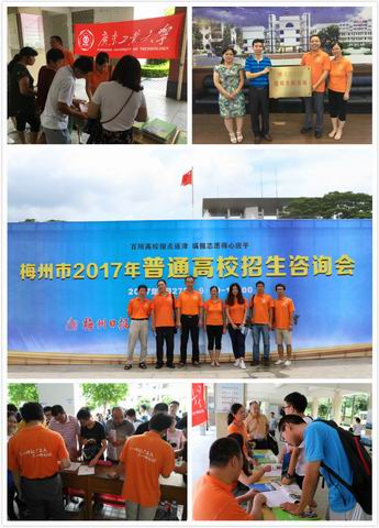 工作组历时四天,行程超过1600公里,足迹遍及梅州地区两区一市五县,克服了天气酷暑和阵雨的重重困难,圆满完成了今年在梅州的招生宣传任务。26号上午,我校代表与兴宁一中张远明校长共同签订了广东工业大学优质生源基地的协议书并合影留念。在东山中学和梅县高级中学,梅州籍材料与能源学院校友冯宏山作为优秀校友代表,参与了工作组的咨询活动,他的现身说法起到了非常明显的宣传效应;在梅州市的咨询现场,虽然天气炎热,骄阳似火,我们学校的摊位还是被学生和家长里三层外三层地围得水泄不通。梅州是革命老区,因此关于贫困地区地方专项计划这方面的咨询特别火爆,工作组每位老师都是汗流浃背全身湿透声音嘶哑,带去的资料也很快被抢光,梅州学子对我校的认同可见一斑。
