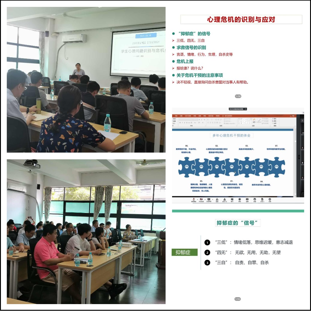 针对教师培训,闵容老师以《学生心理问题识别与危机处理》为主题,从危机的识别、危机的干预以及如何与家长沟通等三个方面系统讲解了心理危机的正确处理程序,通过详细分析各类心理问题的表征,指出相对应的工作方案,并提出了心理工作的主要原则和注意事项。闵老师的系统讲解为老师们正确应对学生心理问题提供正确指引。在针对学生心理委员的培训中,闵容老师以《心理危机识别与应对》为主题,讲解了各类心理问题和求救信号的识别、信息上报的工作流程,并详细讲解了心理预警表单的使用方法,为心理委员反馈心理信息提供科学工具。