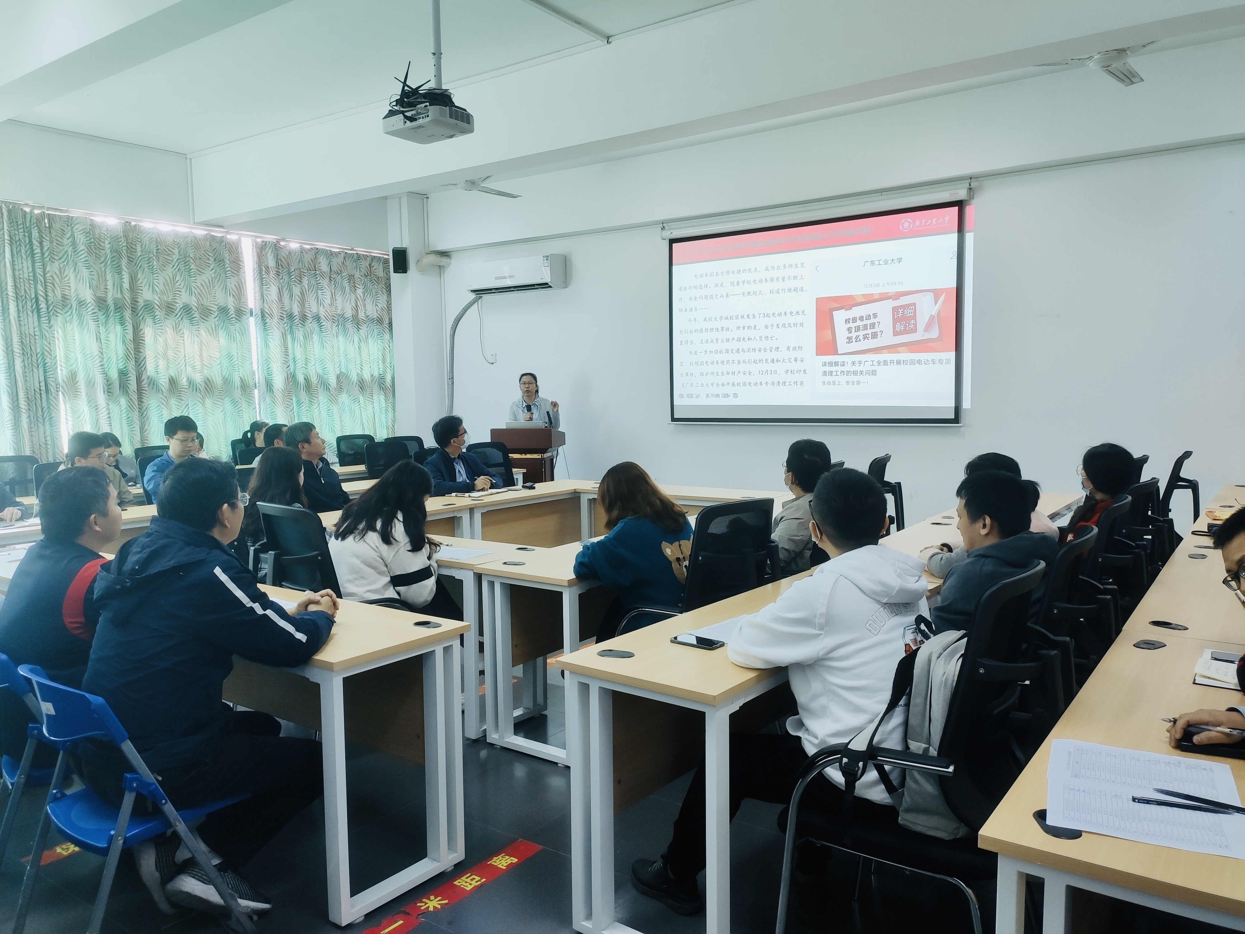 黎展毅传达了学校安全工作会议的工作要求,通报了目前学院学生电动车存有量的分布情况及电动车处置动态情况,还强调了学校严禁电动车电池在学生宿舍和实验室等场所充电的规定,安全高于一切,生命最为宝贵。希望班主任根据各班实际情况,有针对性的开展安全教育工作,维护校园的安全稳定。