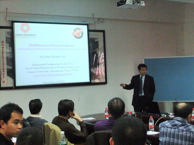 2012年12月14日下午两点,名师大讲堂第二十四讲在工三217室举行。来自拉玛尔大学史密斯号丹化工系助理教授郭占虎博士为bw必威西汉姆联官方网站学子作了主题为《多功能纳米复合材料的应用研究》的讲座。郭教授长期致力于功能化聚合物纳米材料的制备及其在传感、光致发光和电子器件等领域的研究工作,多次获得美国国家科学基金会暑期学院奖学金,获得UCLA校长研究奖荣誉提名。此次讲座由杨元政副院长主持,bw必威西汉姆联官方网站部分老师和相关专业研究生参加了讲座。
