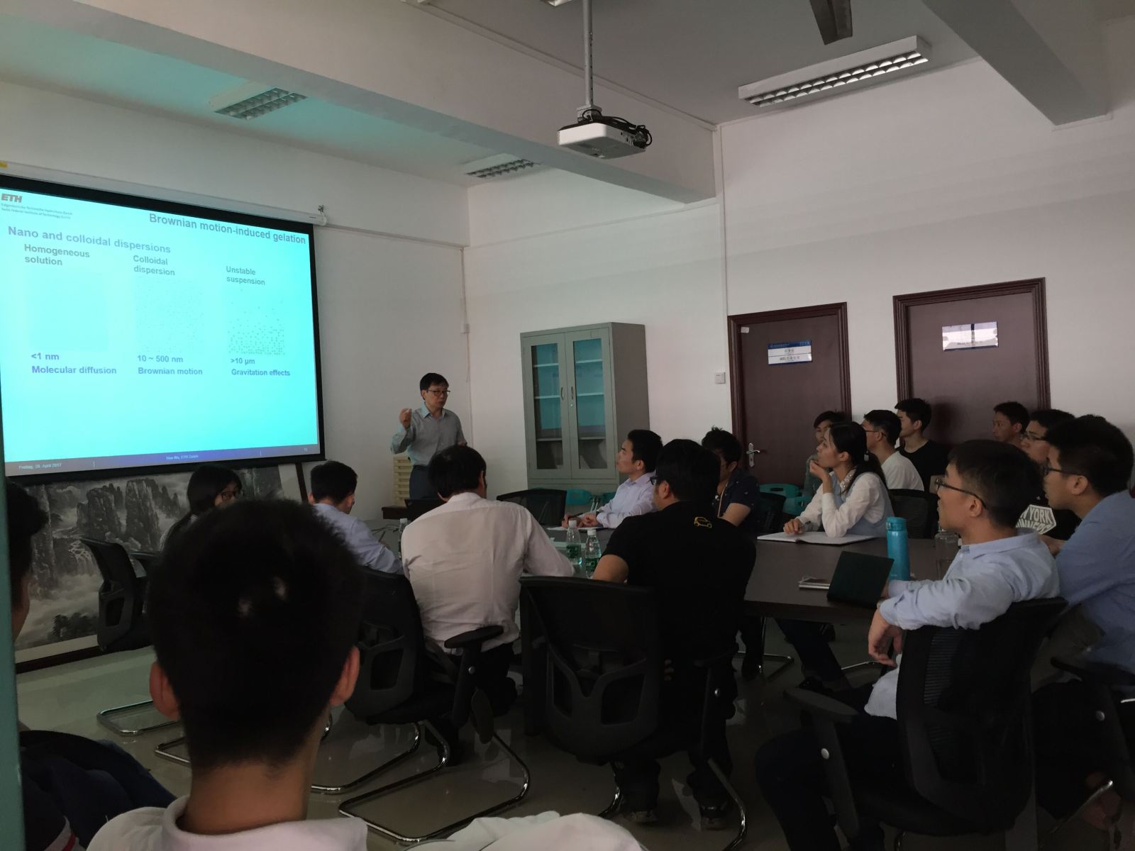 4月28日上午,瑞士联邦苏黎世理工学院(ETH)吴华教授应bw必威西汉姆联官方网站的邀请,在工学三号馆221室举办了一场“从聚合物胶体团聚到结构材料”的精彩报告,报告由陈颖教授主持,现场有来自华南理工大学化学与化工学院张心亚研究员和研究生,以及我校材能、轻化学院的老师和同学们。
