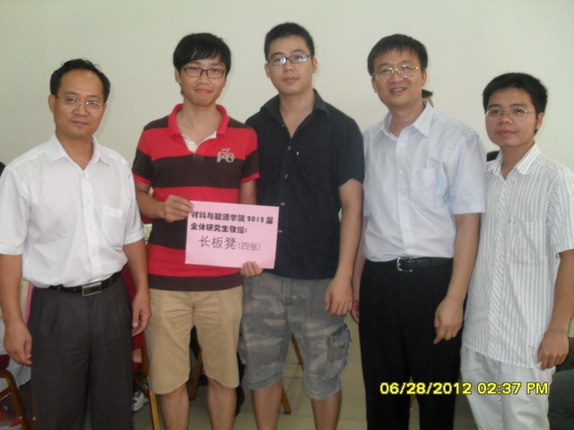 深情别母校,饮水且思源,在2012届毕业生即将离校的特殊日子里,材料与能源学院2012届全体研究生于6月28日中午,向学院捐赠四张长板凳表达学子的感恩之情和对母校的美好祝愿。学院党委杨卫平书记和杨元政副院长代表学院接受捐赠,并与毕业生代表合影留念。