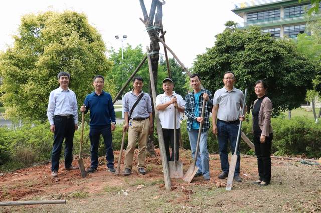 4月10号下午,bw必威西汉姆联官方网站金属材料八二一班校友代表在老班长龙湘的带领下,回到大学城校园开展“我为校园种棵树”活动。该班同学、学校校友会发起人冯耀权、材料学院党委林军书记、材料学院校友理事分会英健文秘书长、辅导员林雨岚和康宇老师参加了植树活动。 在大学城校园知行大道与求是路交界靠近工学四号馆的绿化空地上,在学校园林绿化工作人员的帮助下,借助先进的大型吊装设备,大家齐心协力顺利种下一棵高大的蓝花楹,此次活动是更换八二一班在2006年7月1号毕业20周年种下的前段时间受到雷击的菩提榕,我们期待校友之树年年常绿!校友之花如期盛放!